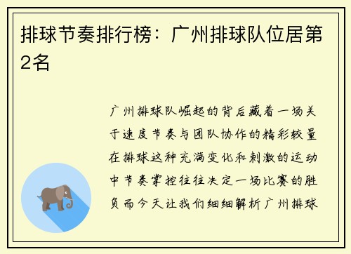 广州排球队再次登顶全国排球技术排名,标志着这支队伍在竞技实力和技术水平上的全面提升。众所周知,排球作为一项集技术、战术与团队合作于一体的运动,其水平的提升不仅依赖于运动员的天赋,更离不开科学的训练体系和创新的战术策略。广州排球队正是在多年的探索与坚持中,逐渐形成了属于自己的独特训练体系,从而实现了技术上的跨越和突破。 回顾广州排球队的成长路径,可以看到他们在培养青少年、引入先进训练设备、优化战术体...