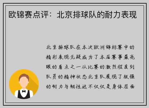 北京排球队,作为中国排坛的传统劲旅,曾无数次站在总决赛的舞台上,经历过辉煌也经历过低谷。在今年的总决赛上,北京排球队展现了无与伦比的突破与坚韧,他们不仅克服了种种困难,还凭借着出色的团队协作和技术创新,完成了从巅峰到再度辉煌的蜕变。 坚持与不屈:突破的第一步 北京排球队的崛起并非一蹴而就。在过去的几年里,球队经历了许多的波动。从人员的调整到战术的变化,每一次变化都带来新的挑战。正是这些挑战,才锤炼...